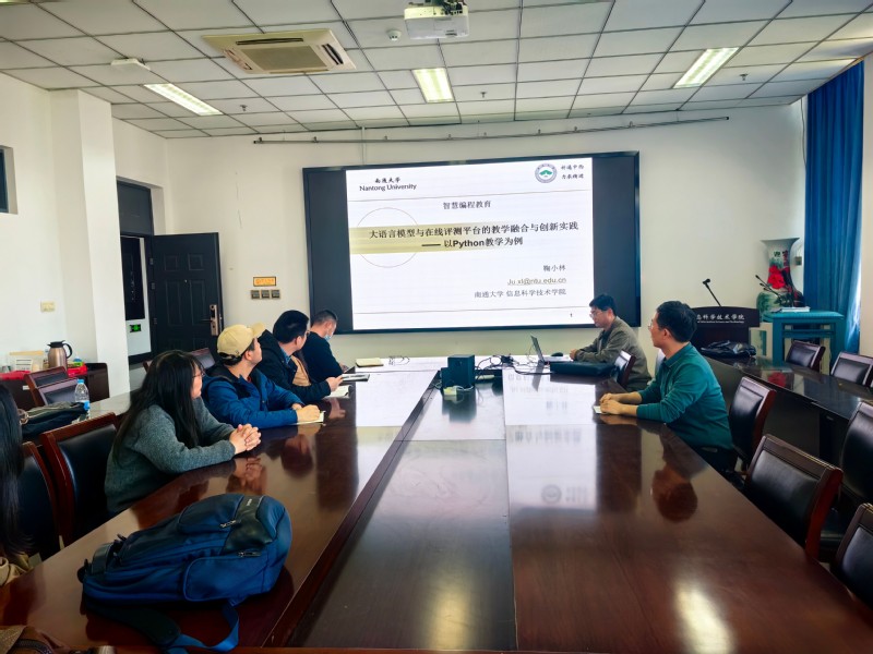 课上,鞠小林老师就《Python程序设计语言》的课程概况、教学内容与目标、教学方法与评价和教学成果等方面进行了详细介绍,并着重分享了基于大语言模型辅助教学的Python编程教学框架,介绍基于核心知识域的编程能力构建,以及融合大语言模型与在线评测引擎的数据分析与智能服务途径。课后,鞠小林老师和学院其他老师也对部署本地化大语言模型过程中的算力保障,以及授课过程中的如何激发学生学习兴趣等问题进行了讨论。