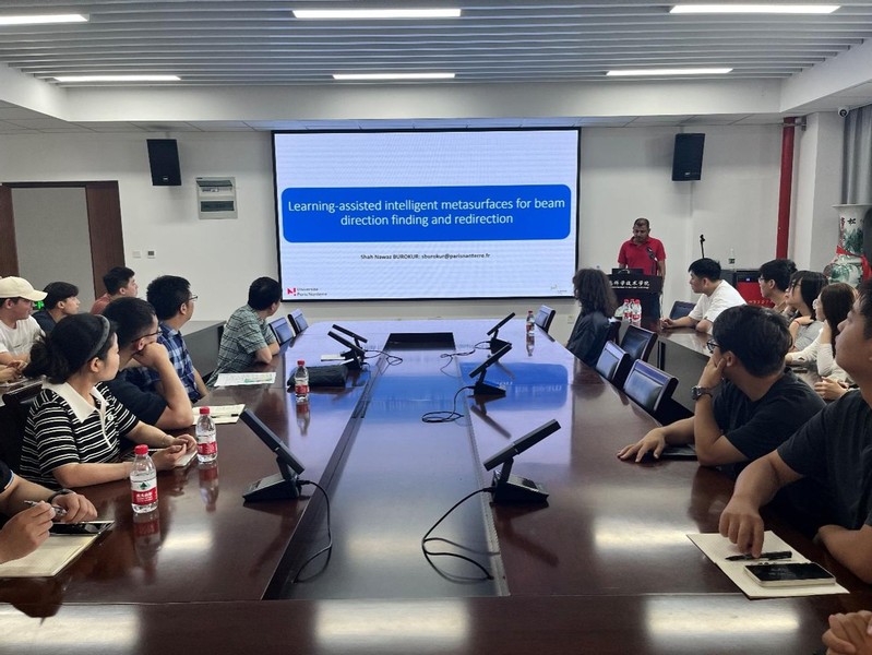 7月24日上午,应学院邀请,法国巴黎楠泰尔大学Shah Nawaz Burokur教授为AV直播 师生作题为《Learning-assisted intelligent metasurfaces for beam direction finding and redirection》(学习辅助智能超表面的波束方向探测与重定向)的学术报告。学院相关教师及研究生代表参加报告会,会议由学院副院长孙强主持。